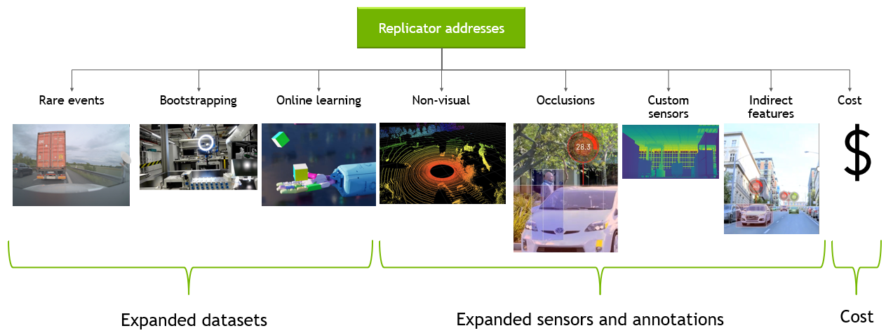 Omniverse Replicator는 딥 러닝 엔지니어 및 연구자에게 데이터 세트 또는 필수 주석 부족으로 인해 불가능했던 기존 모델의 성능을 향상시키거나 새로운 유형의 모델을 개발할 수 있는 일련의 도구와 워크플로우를 제공한다. 사용자는 시뮬레이션 준비 자산을 쉽게 가져와 상황별 인식 3D 장면을 구축할 수 있으며, 이전에는 사용할 수 없었던 새로운 유형의 데이터 세트와 주석을 생성하여 데이터 중심 접근 방식을 활용할 수 있습니다.