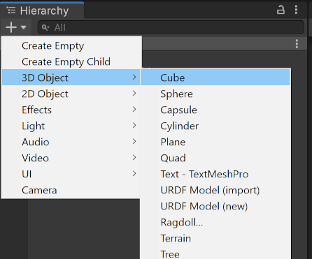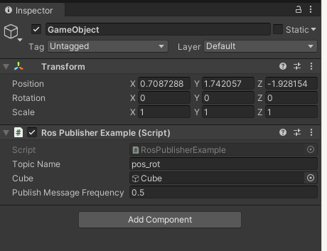 RosPublisherExample를 GameObject에 드레그엔 드롭으로 놓고 cube도 내부에 드래그엔 드롭으로 넣는다.