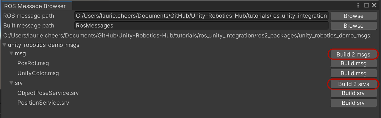 유니티에서 Assets/RosMessages/UnityRoboticsDemo/msg와 Assets/RosMessages/UnityRoboticsDemo/srv가 생성된 것을 알 수 있다.